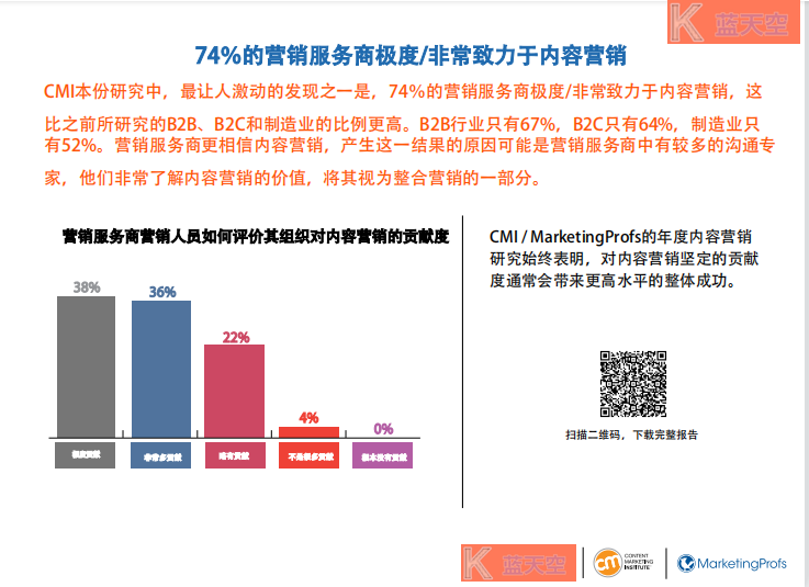 营销服务商(Agency)提供内容营销服务,能更好地为他们的客户提供整体的整合营销计 划。美国内容营销协会推出的《2019年北美营销服务商内容营销行业基准、预算及趋向》 回答了北美Agency如何使用内容营销来推广服务的问题,蓝天空解读中国市场Agency内 容营销现状。