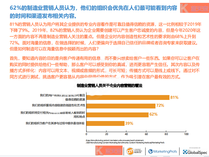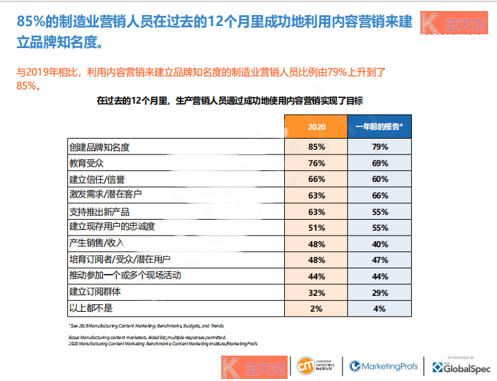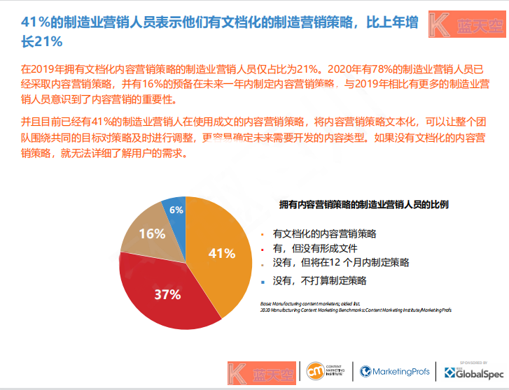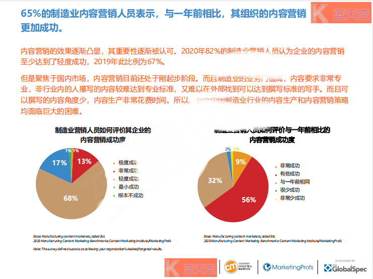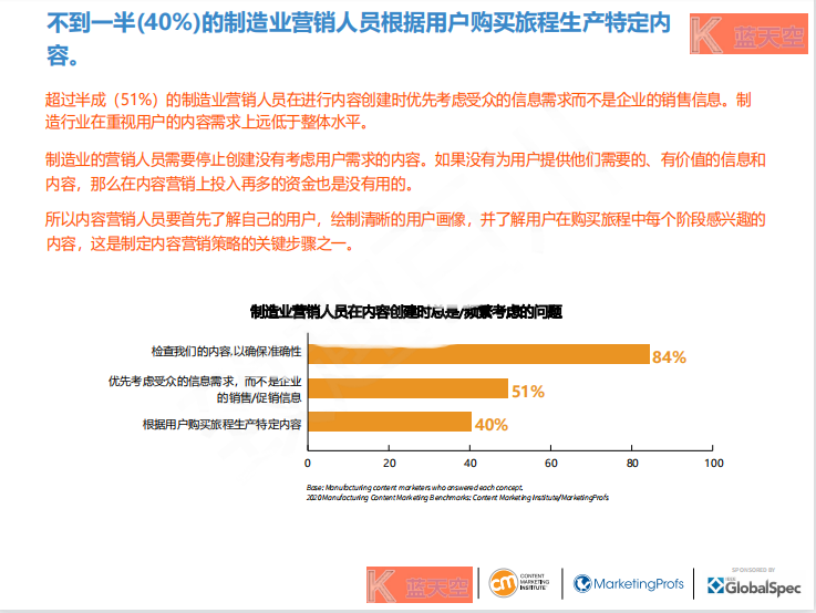 美国内容营销协会推出的《2020年制造业内容营销行业基准、预算及趋向》,对中国制造业营销有较强借鉴意义,但中国市场的特殊性不容忽视,蓝天空立足中国市场,解读中国制造业内 容营销的故事: